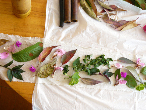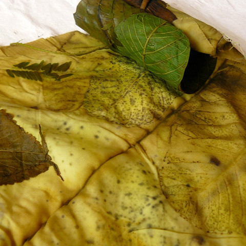 Logo que comecei a me interessar pelo tingimento natural – pesquisava incansavelmente por tutoriais pela internet – e descobri a impressão botânica. Esta foto acima foi uma das minhas primeiras tentativas. Sobre um retalho de seda que já estava tingido, distribui pedaços da folha do chapéu-de-sol, folhas de eucalipto, hibisco seco, uma folha de goiaba, uma flor do camarão vermelho e gruminhos de polén. Por um lado o resultado foi decepcionante: "porque as folhas não ficam impressas com o contorno correto?", pensei. Por outro lado, fiquei tão fascinada pelas cores desse mix tão reduzido de plantas que intensifiquei minhas pesquisas.
