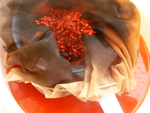 Depois das sementes bem piladinhas, o processo é sempre o mesmo: deixá-las de molho em água, ferver, coar a tintura e mergulhar os tecidos para tingí-los.